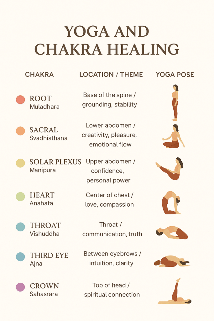 Root ChakraBase of the spine / grounding, stabilityMountain Pose (Tadasana)Helps you feel grounded, connected to the earth, and stable in body and mind.